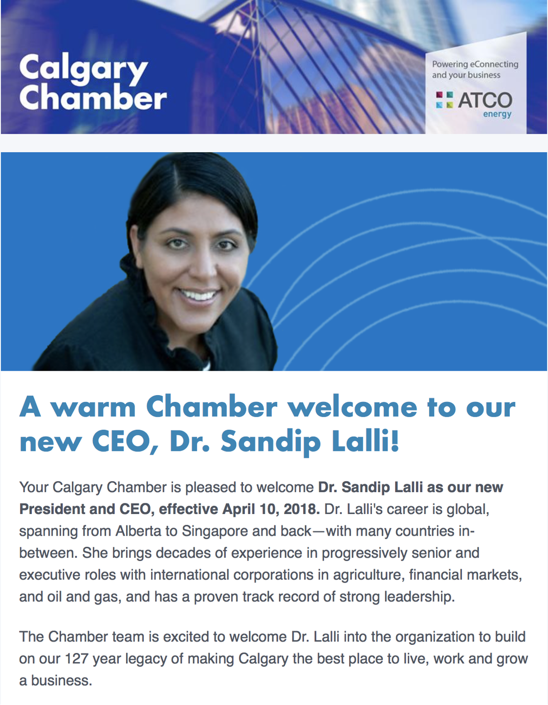 In December, we emerged victorious from a very competitive process amongst 11 invited search firms and were selected as the Calgary Chamber of Commerce’s preferred executive search firm to lead its very high-profile CEO search. A few months later, we closed the search, Dr. Sandip Lalli having been awarded the job after a hard-fought competition. Throughout the search we were able to show a broad cross-section of civic leaders, influencers and stakeholders what we’re all about. Sandip will do an amazing job as a fresh new face for the Chamber and we earned kudos along the way, too.