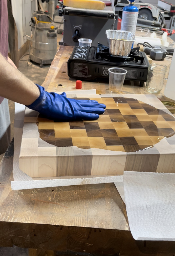 These end-grain cutting boards are not inexpensive. Even with his self-ascribed paltry labour charge of $25/hr (he doesn’t listen to all my advice) the materials – wood, glue, home-made beeswax, love – all cost money. The tools depreciate and require frequent maintenance. And when the cost of supplies goes up, so too does the cost of the end-product.