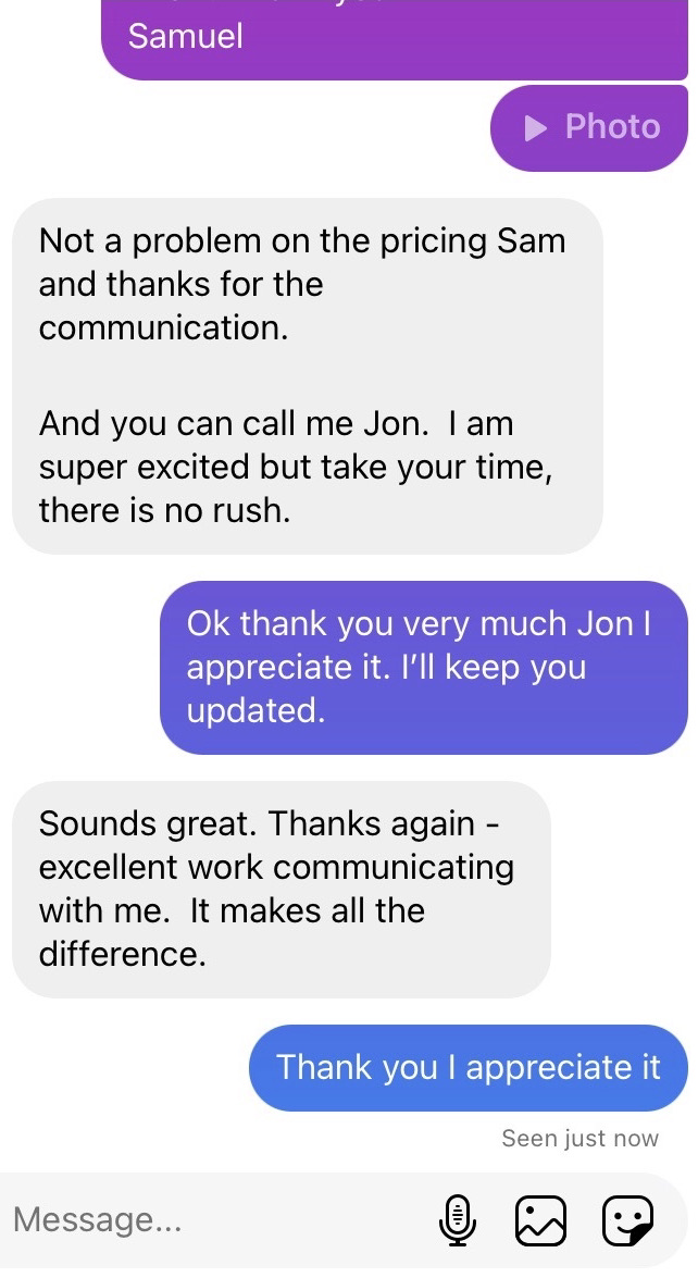 The client response? “Not a problem on the pricing Sam and thanks for the communication.” In fact, he so appreciated the honesty and Sammy’s getting out in front of the bad news that it made him admire the craft and the craftsman that much more. Communication. It makes all the difference. A day after the text exchange, Jon called me directly to relay how completely blown away he was with the clear, proactive message. The maturity, the poise, the genuine concern he detected in Sammy’s communication as he relayed the news: circumstances had changed. “I can’t get my own law partners to call a client when the file is going to cost more than we’d thought! Yet this kid just calls me up, and spells it out. Incredible…” Jon exclaimed, with a mixture of exasperation and admiration.