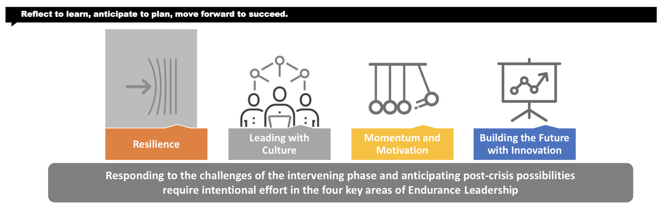 They describe the challenge of leading through this period of slow and uncertain re-opening as follows: “We believe this constitutes a new phase of the COVID-19 crisis as we move out of the initial response and into a sustained, intervening period as medical experts continue to work toward a full resolution. Leadership needs to be more intentional and resilient than ever before to respond to opportunities and innovate now, enabling present success and shaping, rather than holding out for, an unrestricted future.”