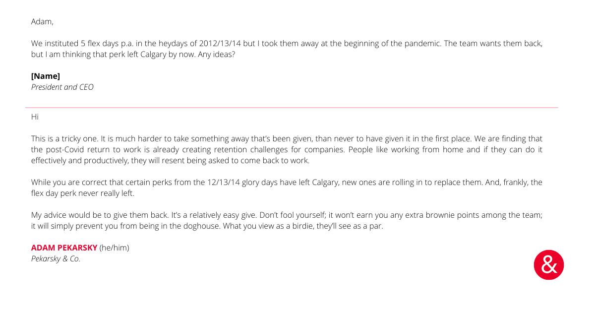 Make no mistake, in these parts at least, working from home is no longer (for now) a necessary imperative borne of an urgent need to keep each other safe and homeschool our kids. It is little more than another recruitment and retention tool. Those organizations that doggedly insist on a return to the past will lose people. This may not have been concerning when times were quiet, the leverage residing firmly with the employer (“where are they going to go, anyway?”) but in a booming market your people have options, and after 18 months at home they have savings and lengthy bucket lists, too. And they’ll vote with their feet. You’d be shocked to learn how easily they are triggered to leave for reasons unrelated to more traditional grievances.